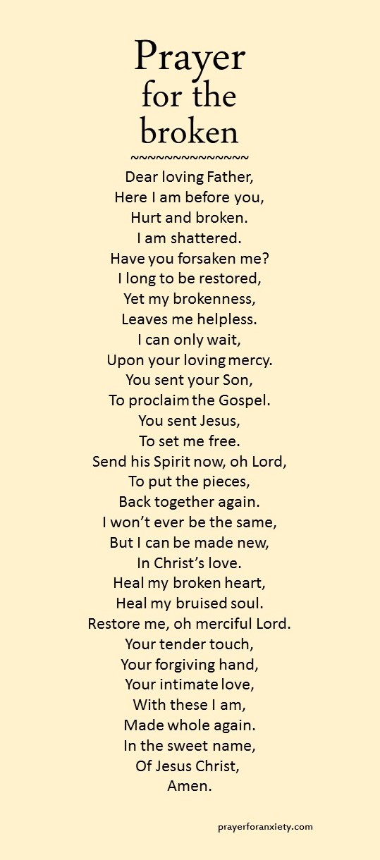 This prayer for the broken-hearted can help you to look to God for healing. The past cannot be changed, but through God’s tenderness, the future holds a great promise of restoration.